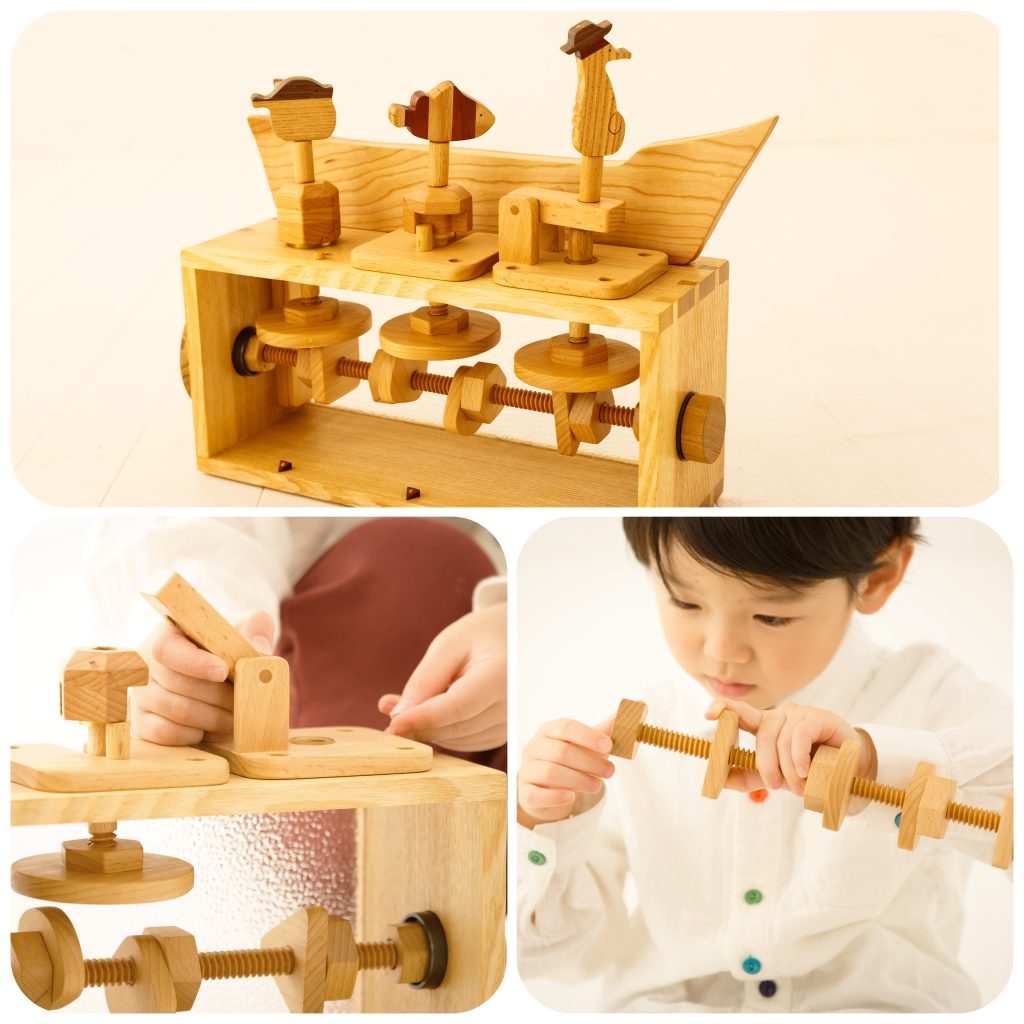 最初は歯固めや転がし遊びからスタートし、成長と共に知恵の輪などの仕組み遊びへ変化します。木の温もりに触れ合いながら、理系脳やプログラミング的思考の土台を育む、本格エンジニアリング知育です。